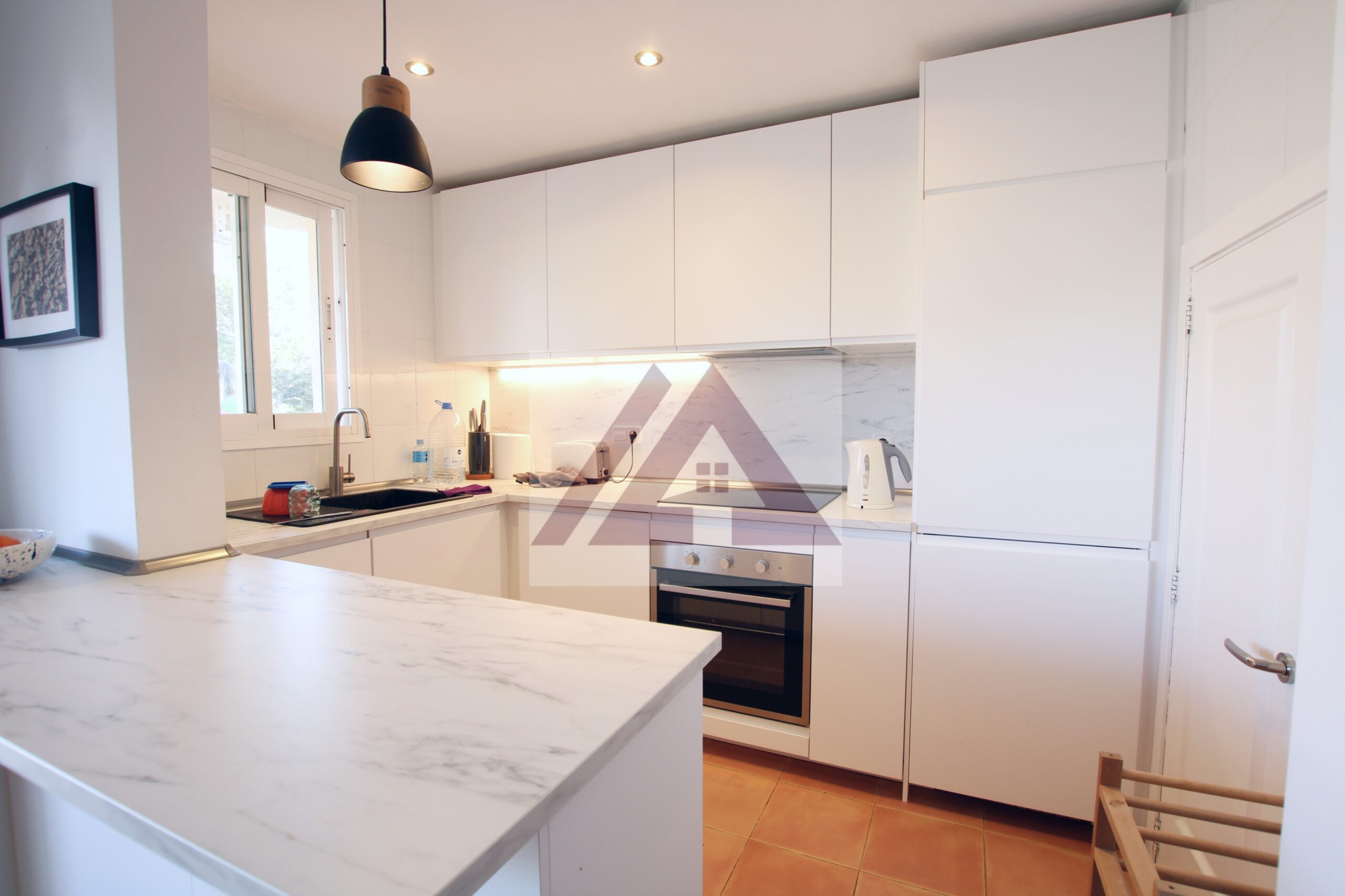 Se accede directamente al luminoso salón- comedor con cocina con barra americana, equipada con electrodomésticos nuevos, cuales lavavajillas, horno, micro, fogones y nevera combi.