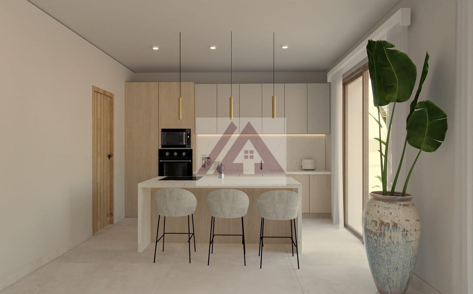 La elegante cocina tipo isla con una amplia despensa, una coladuría y sala de maquinas.