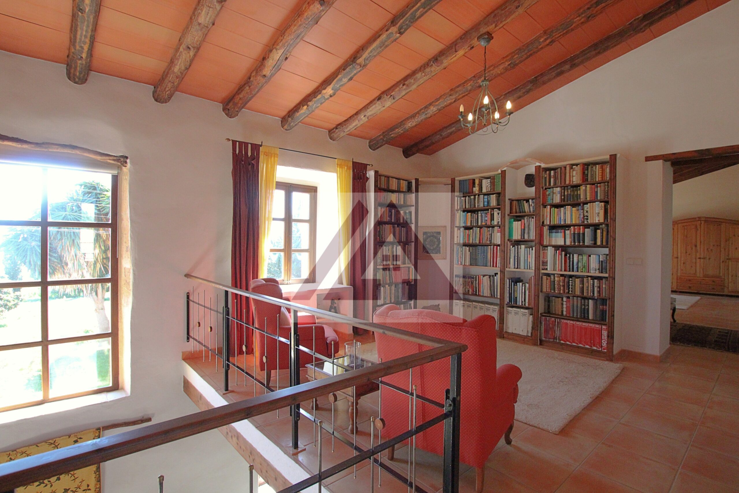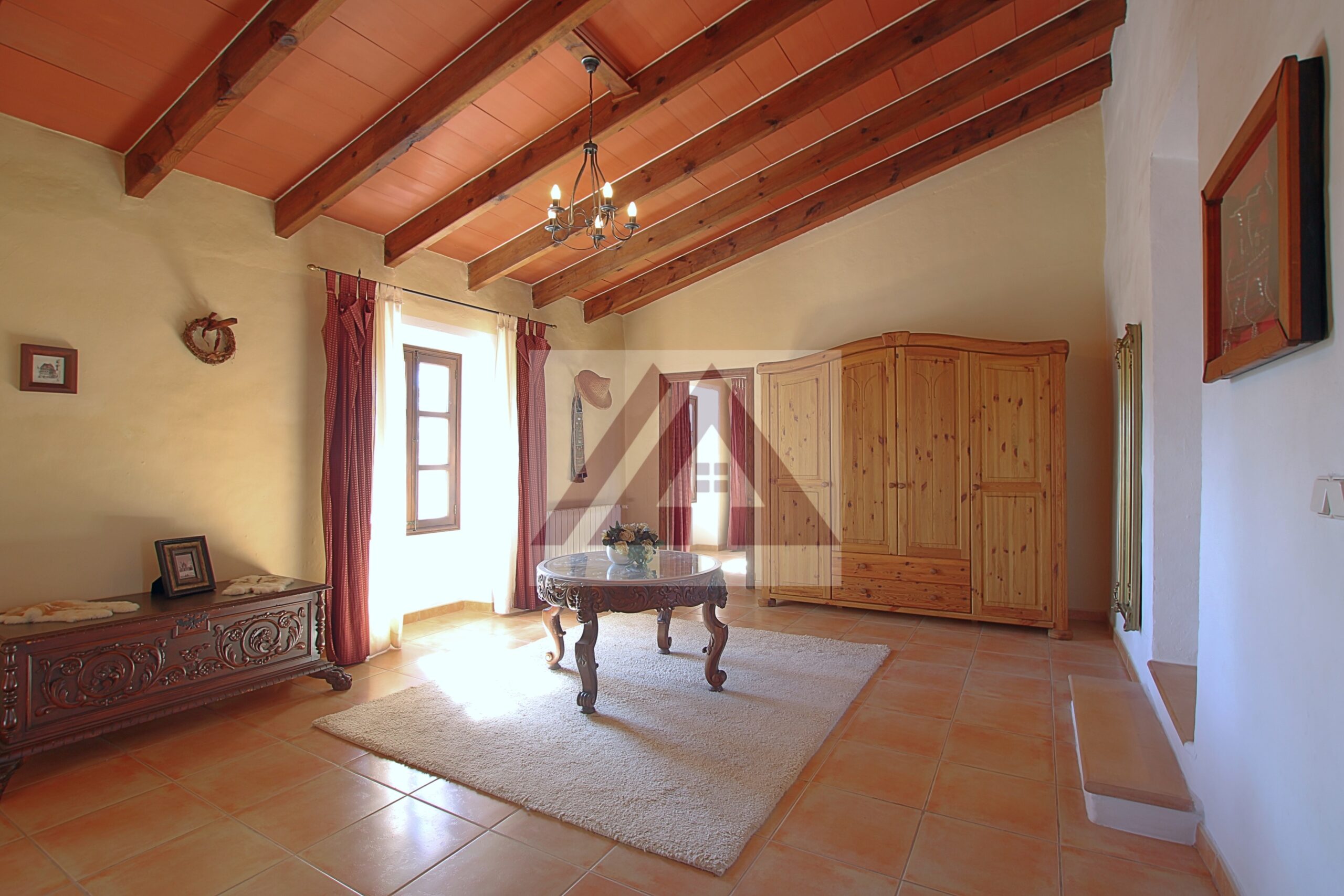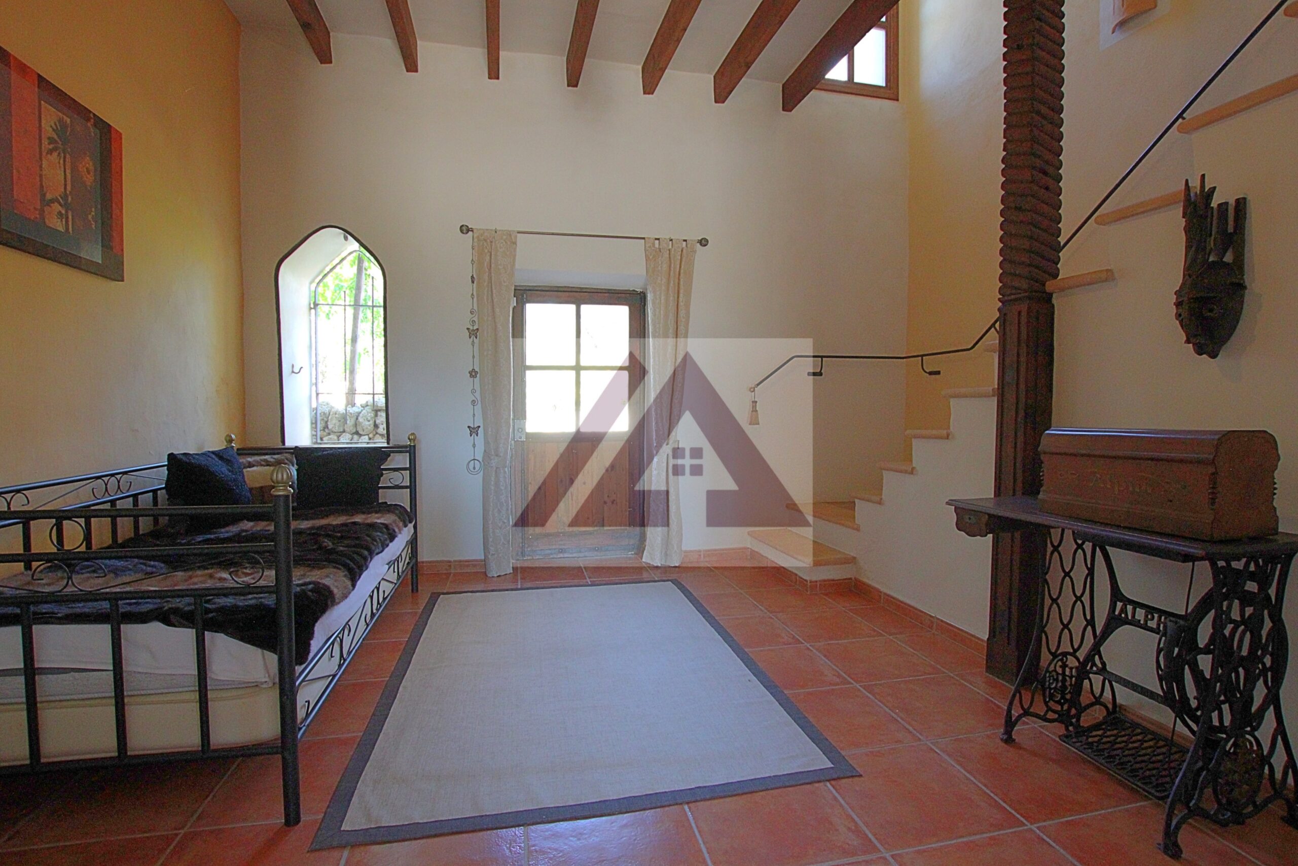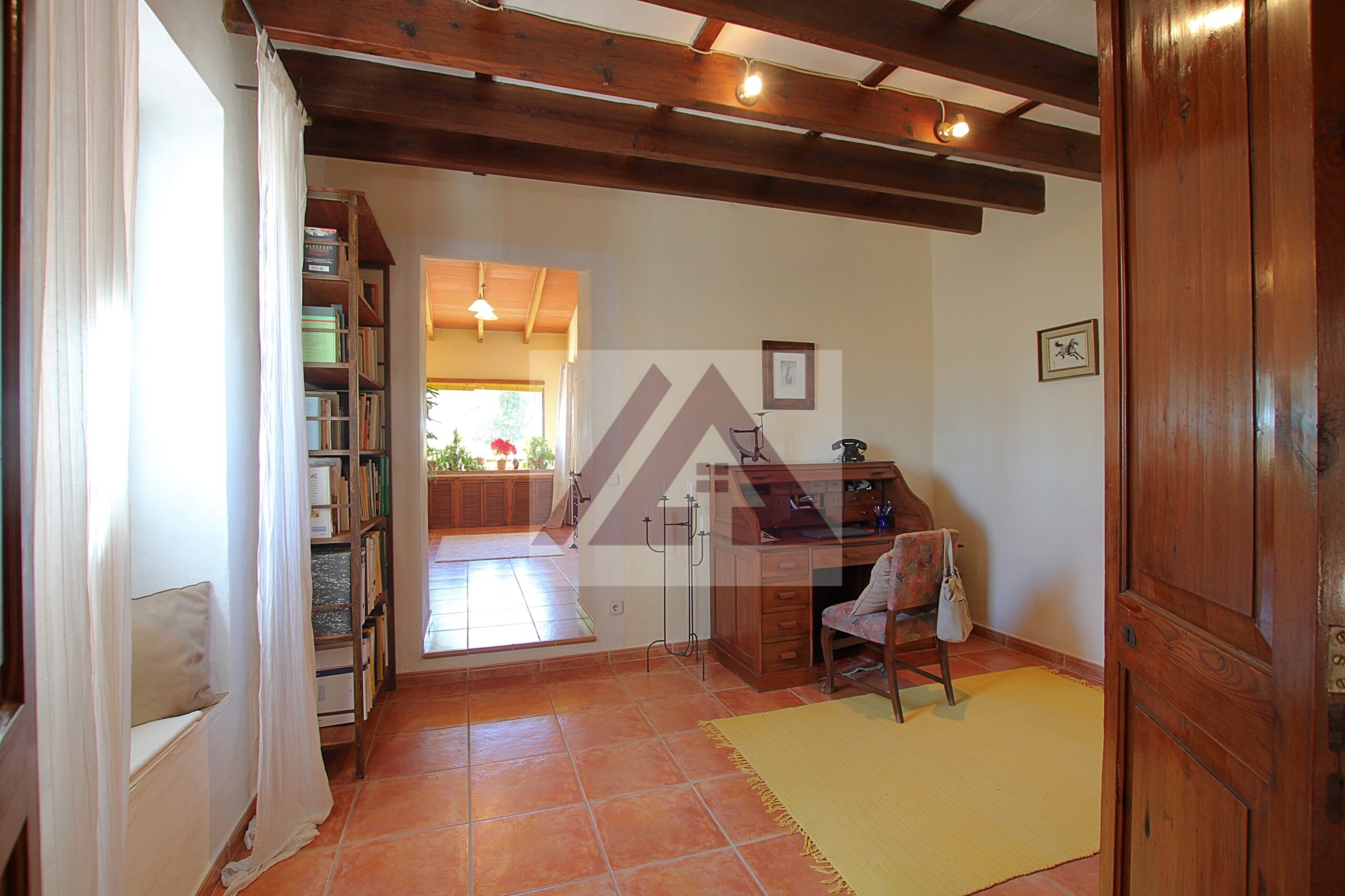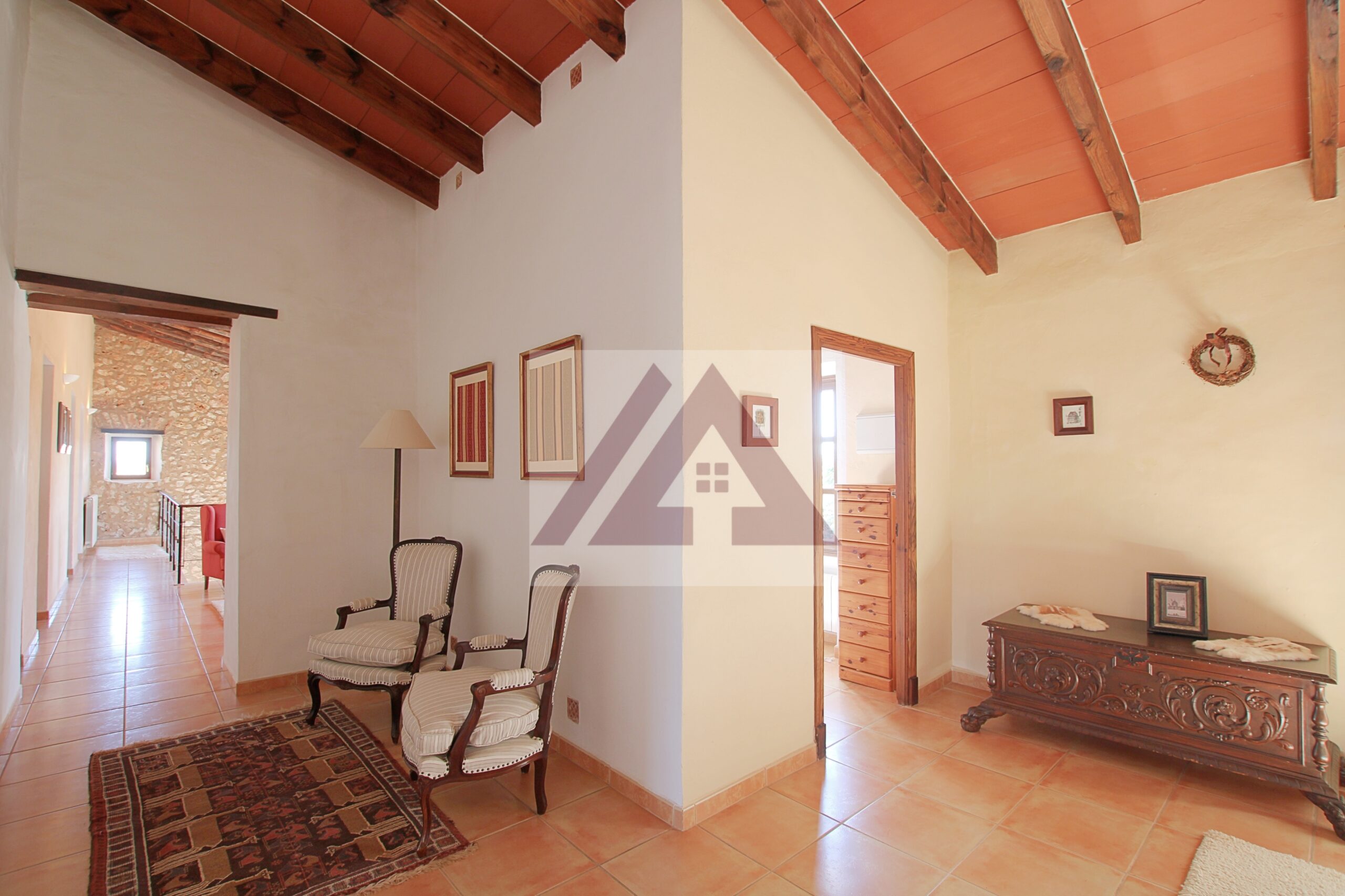 Das Haupthaus erstreckt sich über zwei Etagen, wobei sich im Erdgeschoss ein helles Wohnzimmer mit hohen Decken, sichtbaren Holzbalken, Steinwänden und einem restaurierten antiken Kamin, eine große Küche im Office-Stil und ein helles Esszimmer mit einem weiteren Kamin, ein Büro, eine Gästetoilette und ein Ausgang zur überdachten Terrasse mit einem authentischen mallorquinischen Ofen befinden.