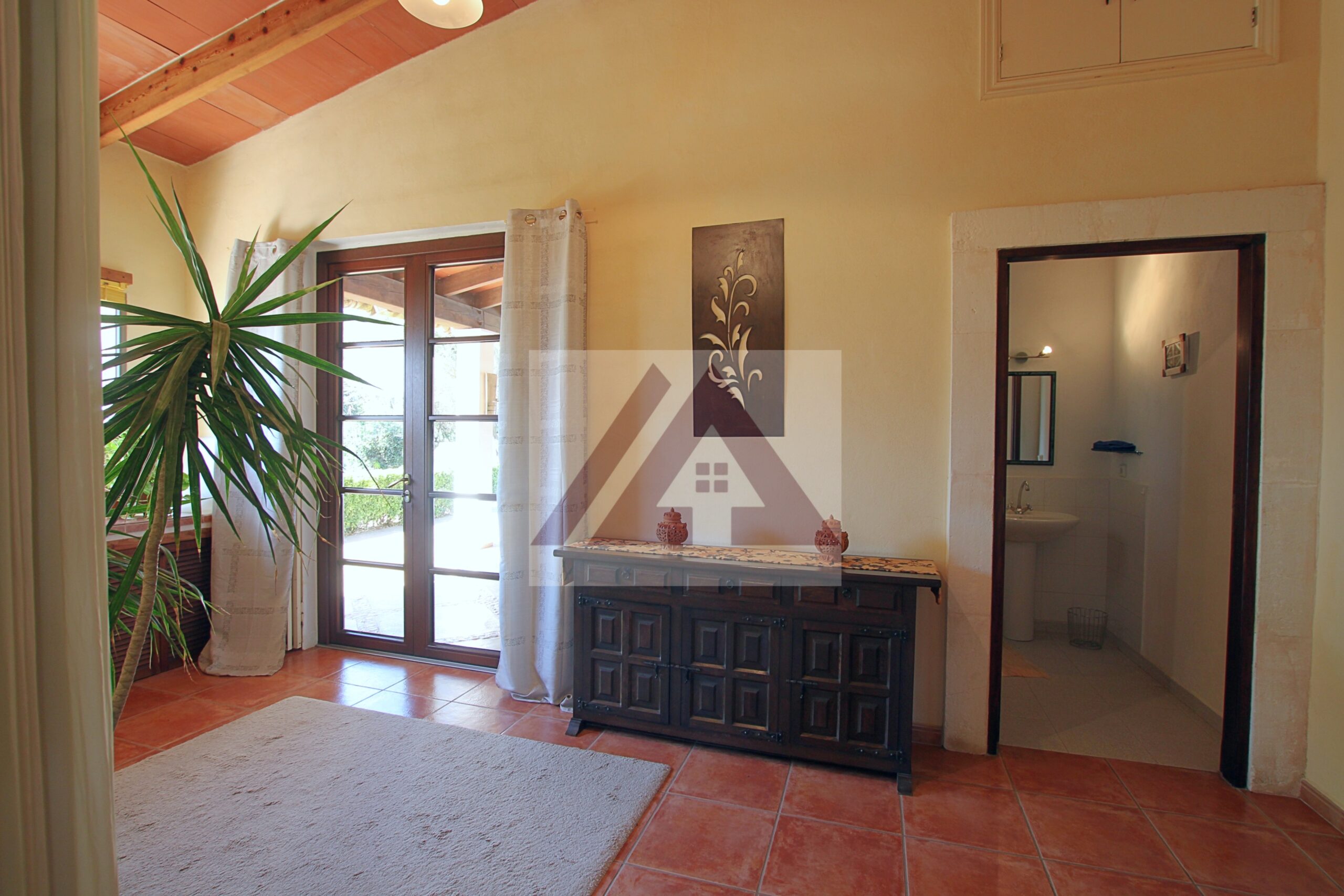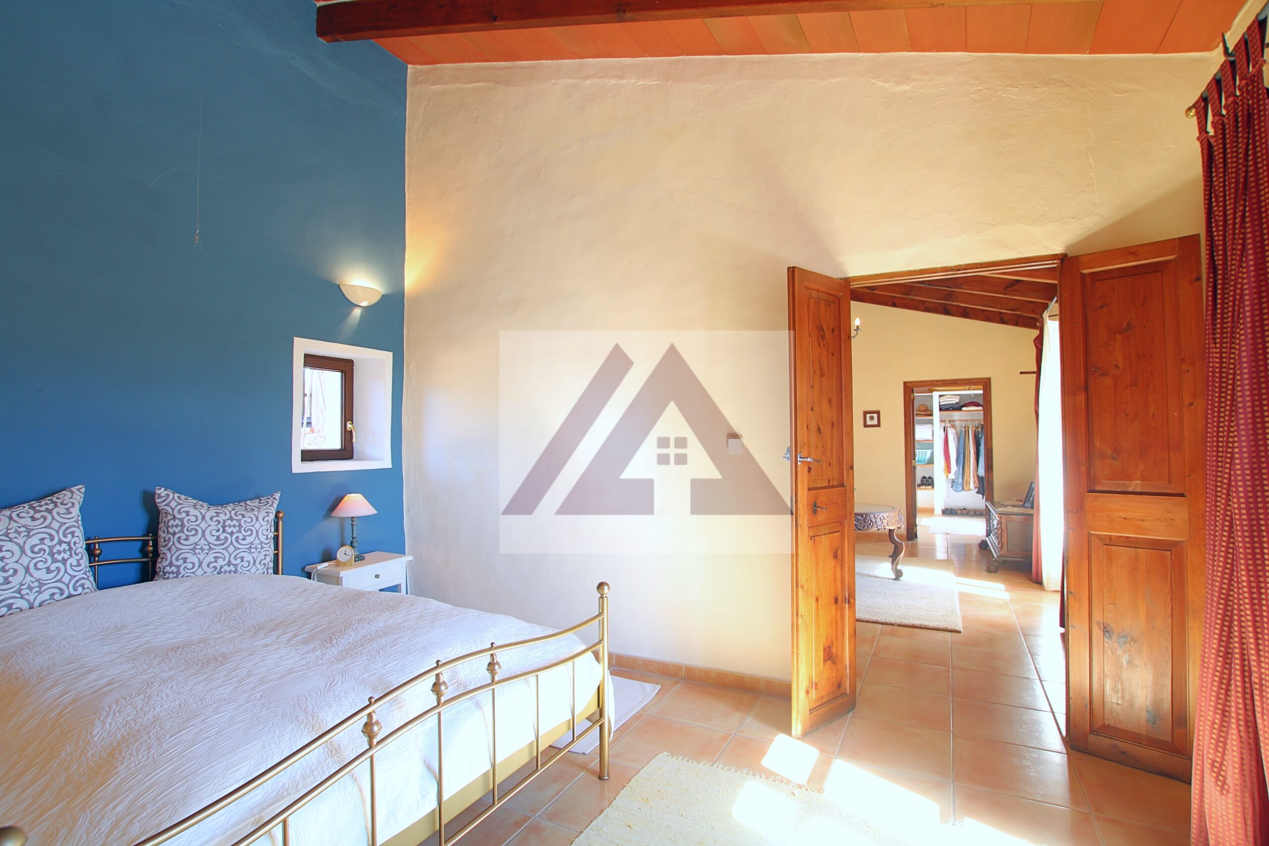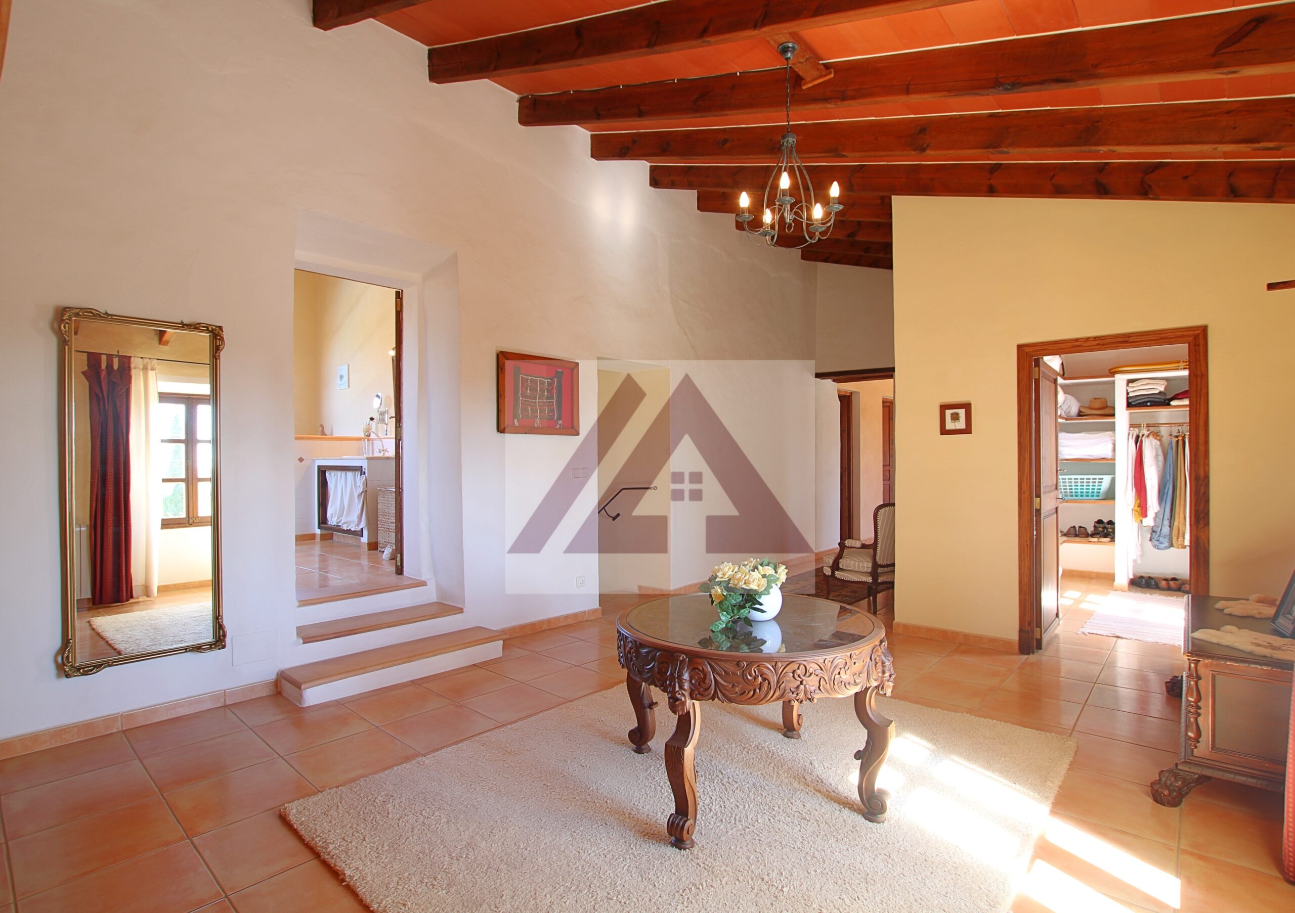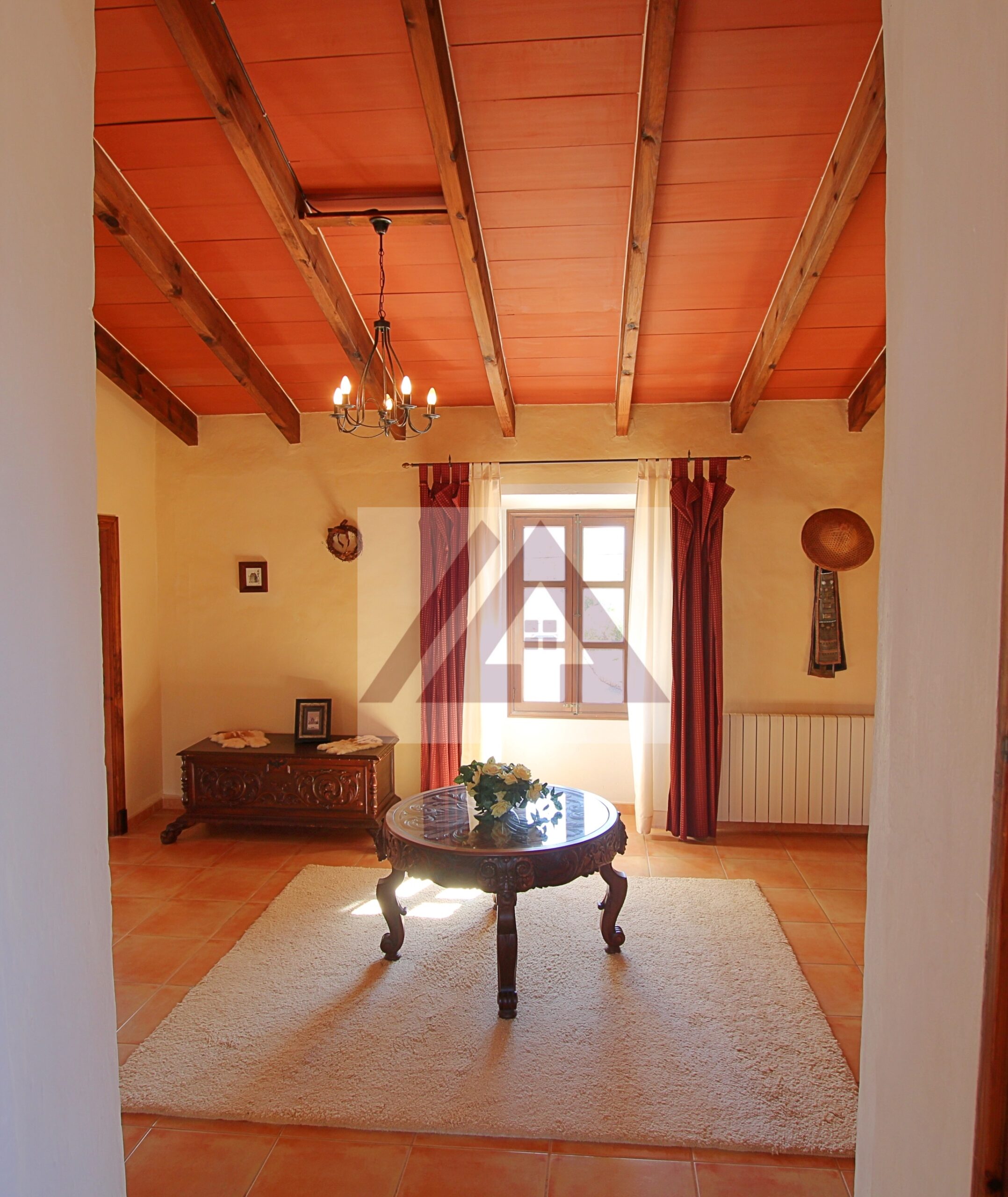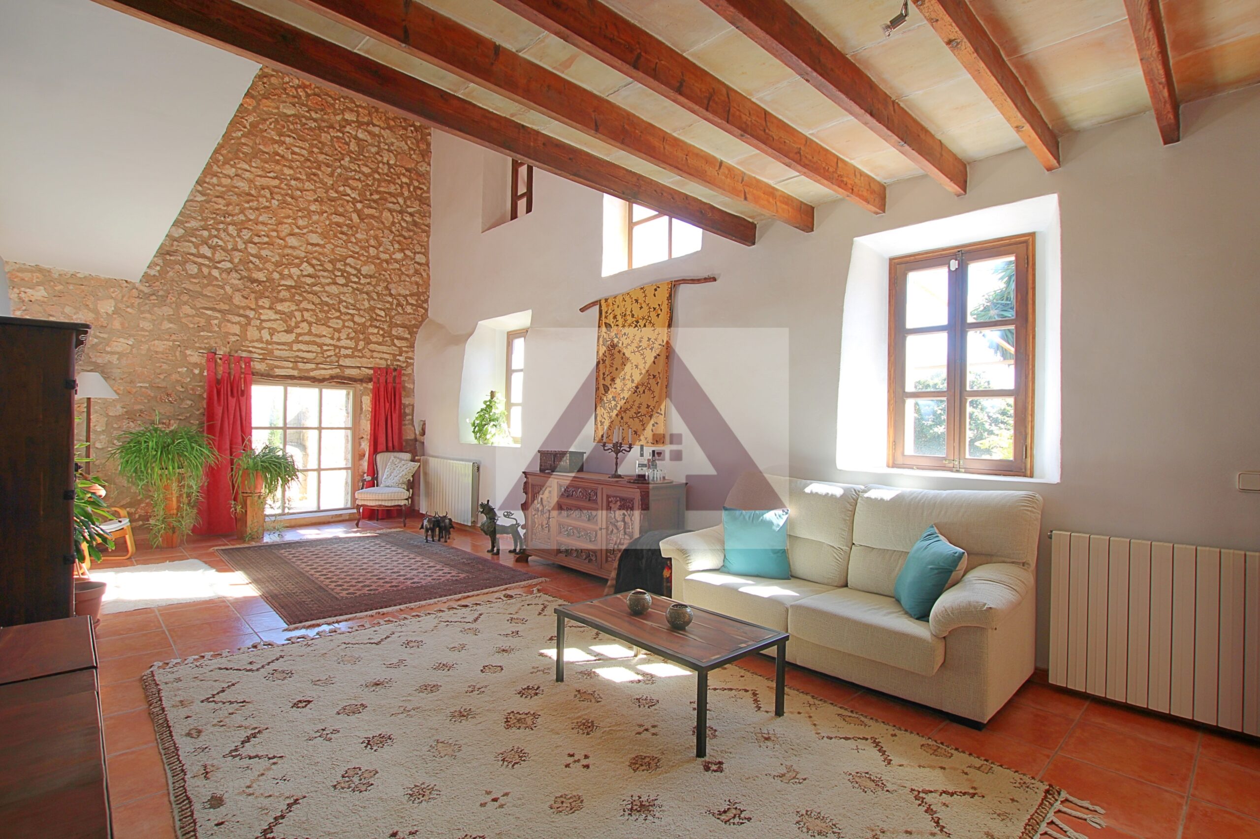 Das Haupthaus erstreckt sich über zwei Etagen, wobei sich im Erdgeschoss ein helles Wohnzimmer mit hohen Decken, sichtbaren Holzbalken, Steinwänden und einem restaurierten antiken Kamin, eine große Küche im Office-Stil und ein helles Esszimmer mit einem weiteren Kamin, ein Büro, eine Gästetoilette und ein Ausgang zur überdachten Terrasse mit einem authentischen mallorquinischen Ofen befinden.