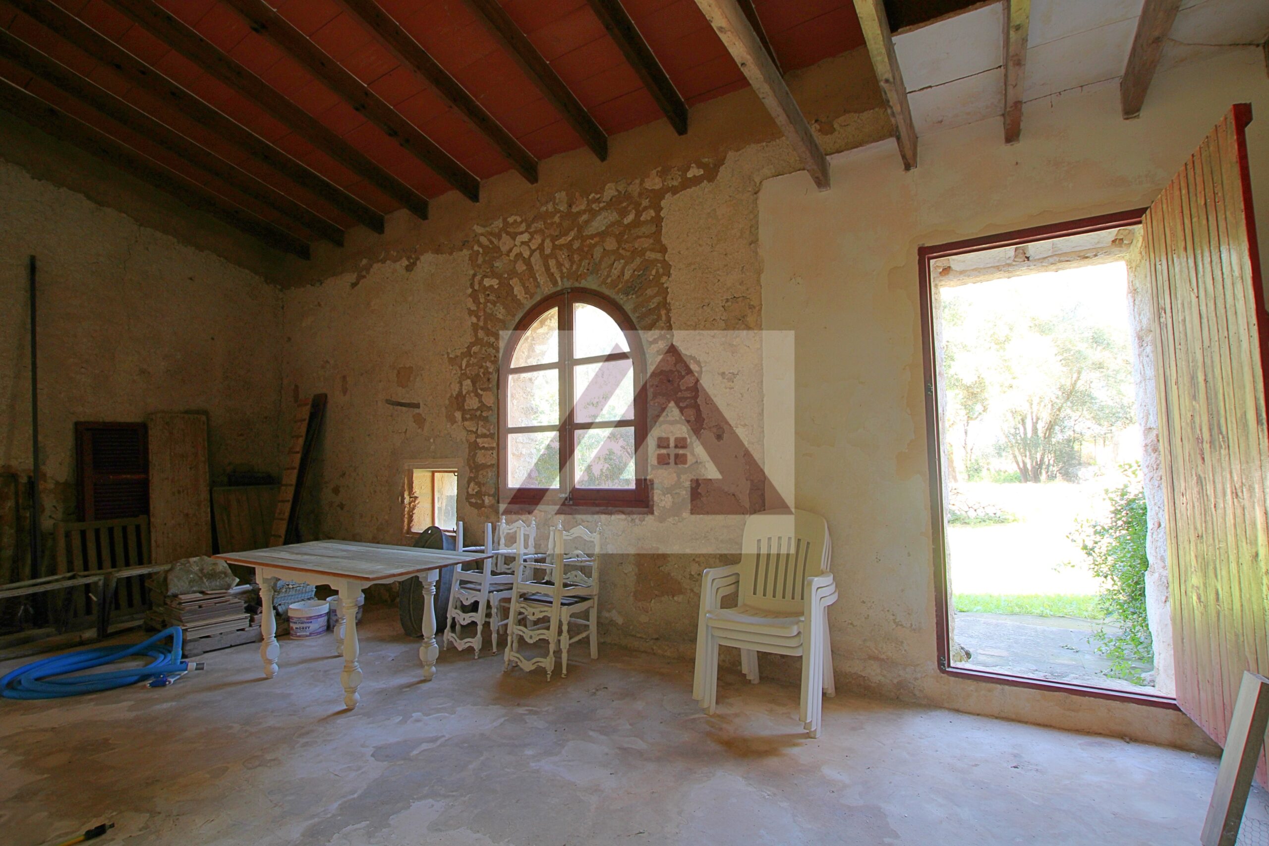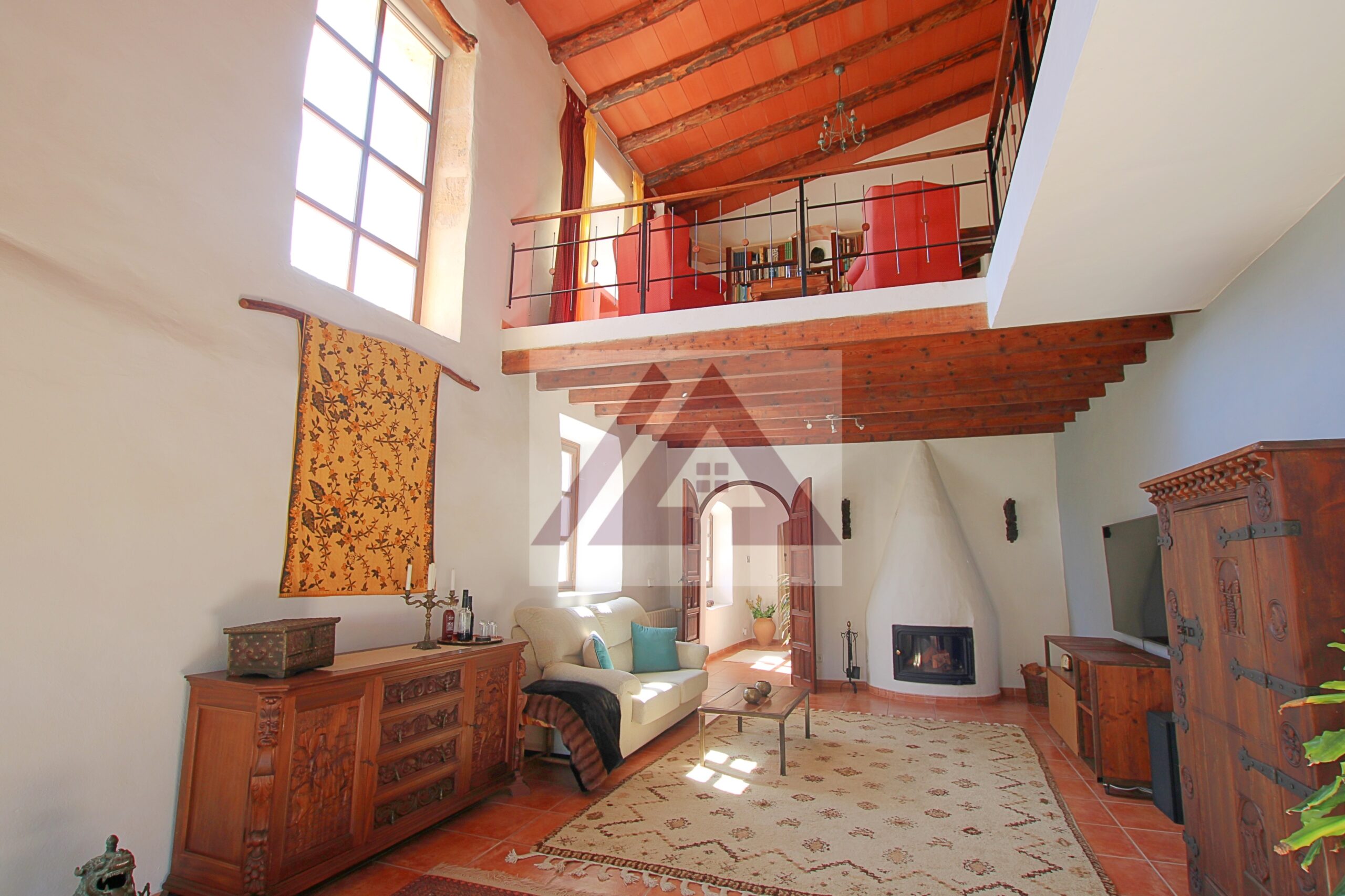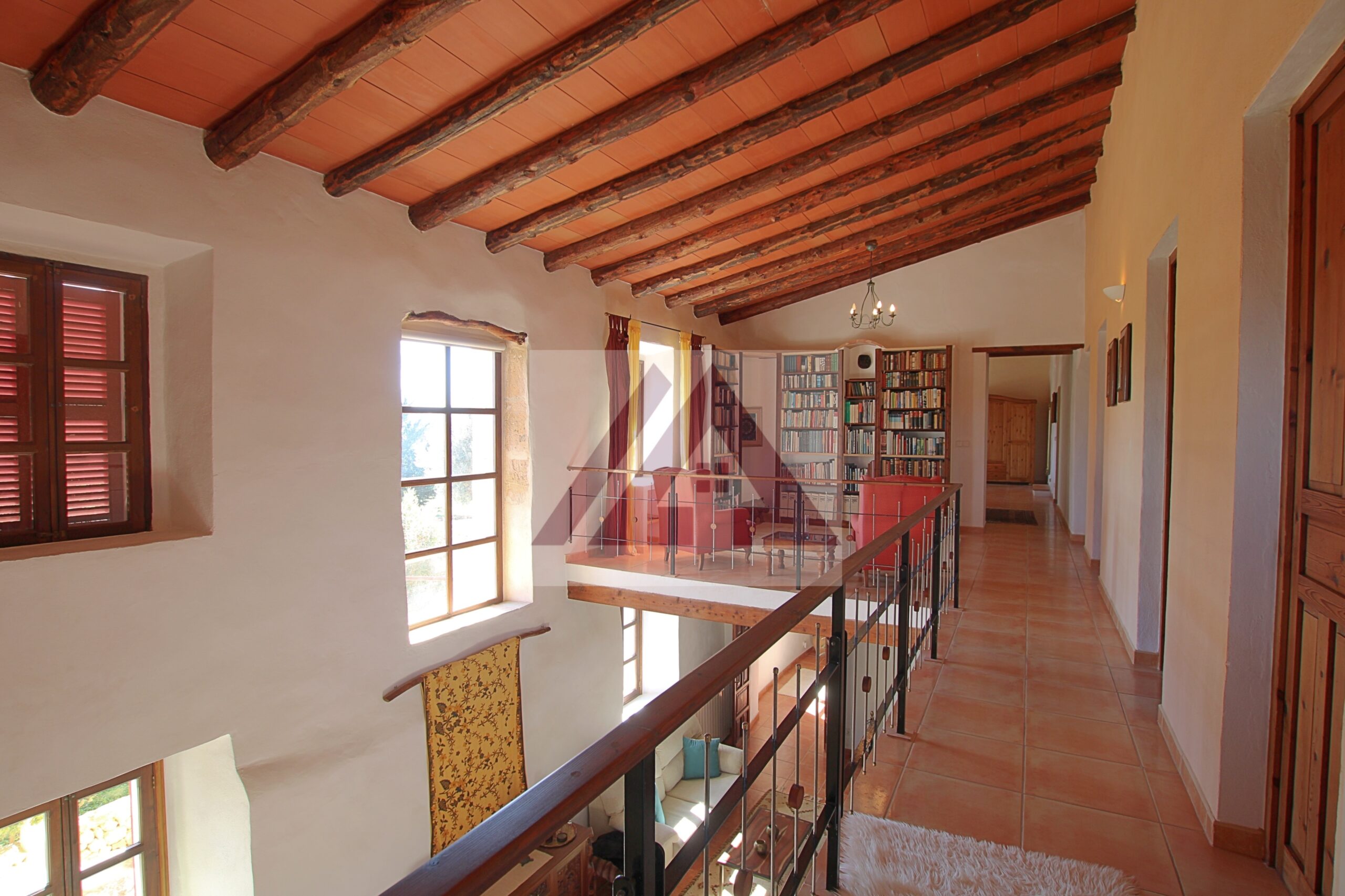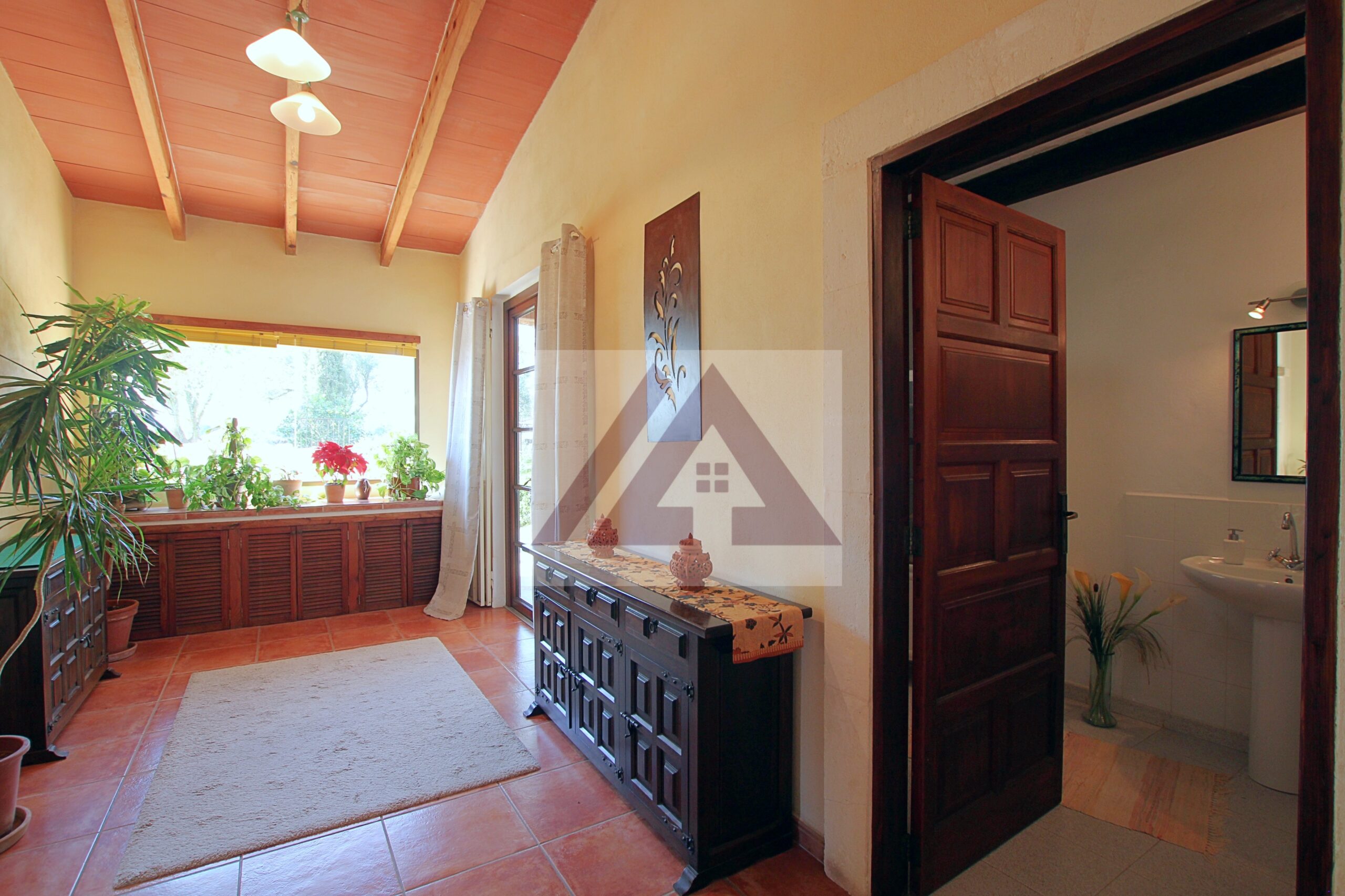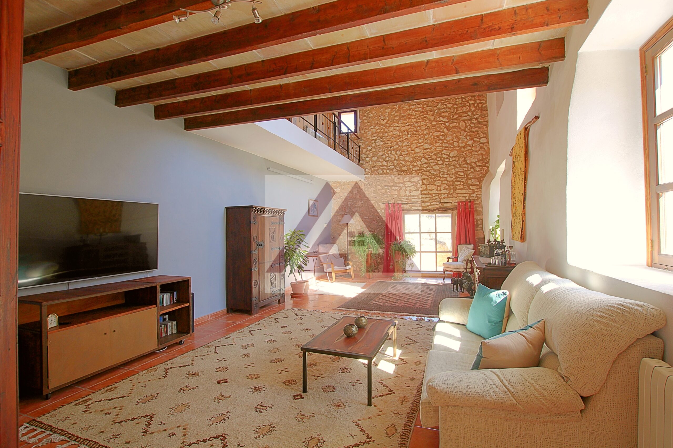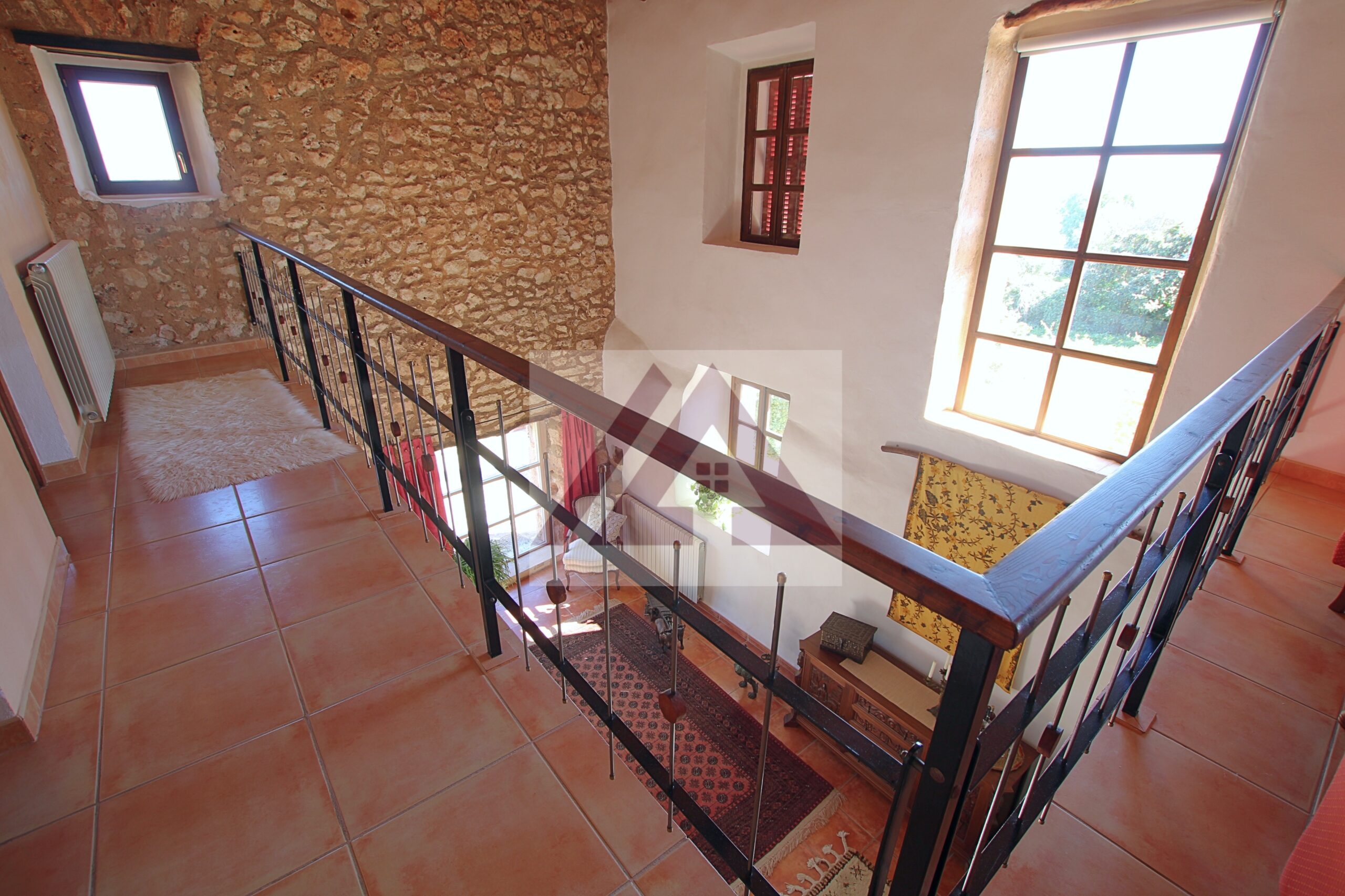 Das Haupthaus erstreckt sich über zwei Etagen, wobei sich im Erdgeschoss ein helles Wohnzimmer mit hohen Decken, sichtbaren Holzbalken, Steinwänden und einem restaurierten antiken Kamin, eine große Küche im Office-Stil und ein helles Esszimmer mit einem weiteren Kamin, ein Büro, eine Gästetoilette und ein Ausgang zur überdachten Terrasse mit einem authentischen mallorquinischen Ofen befinden.