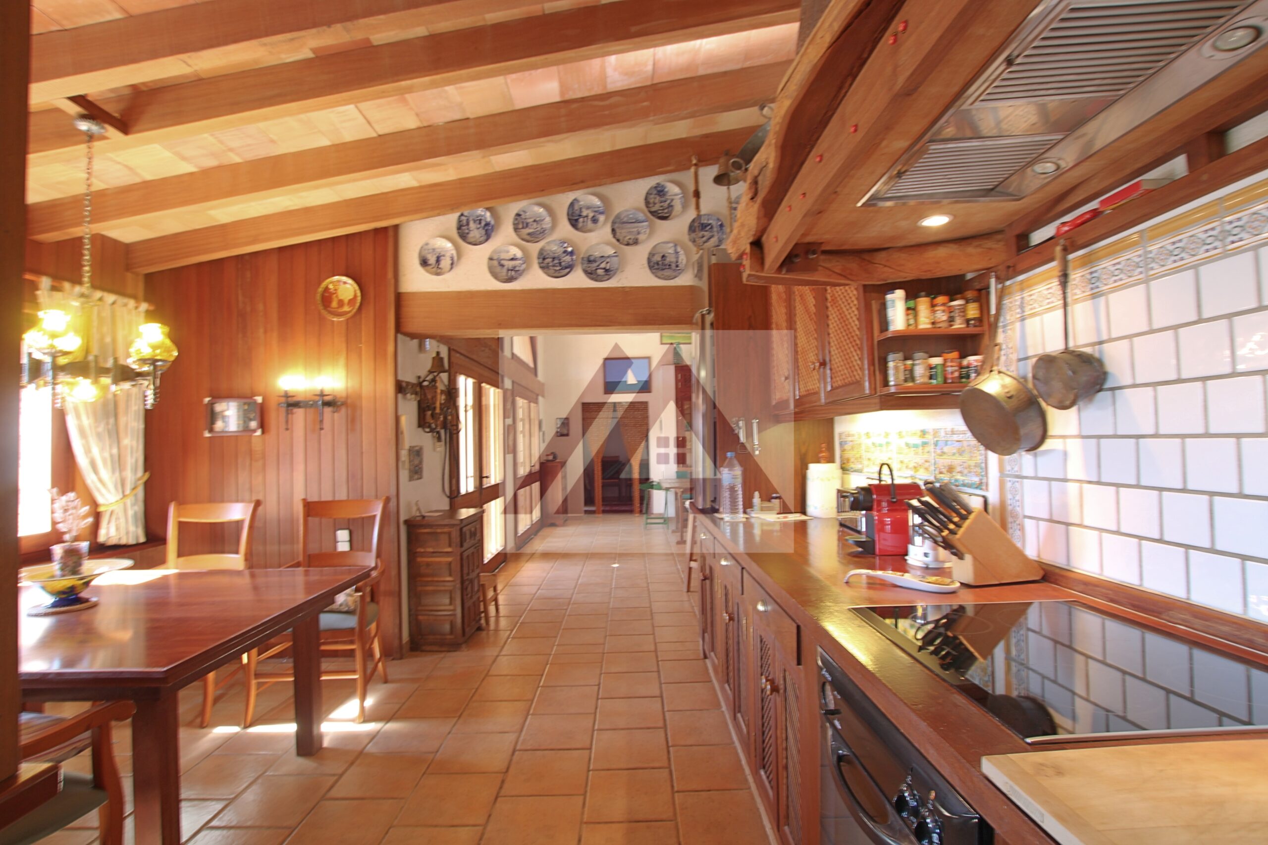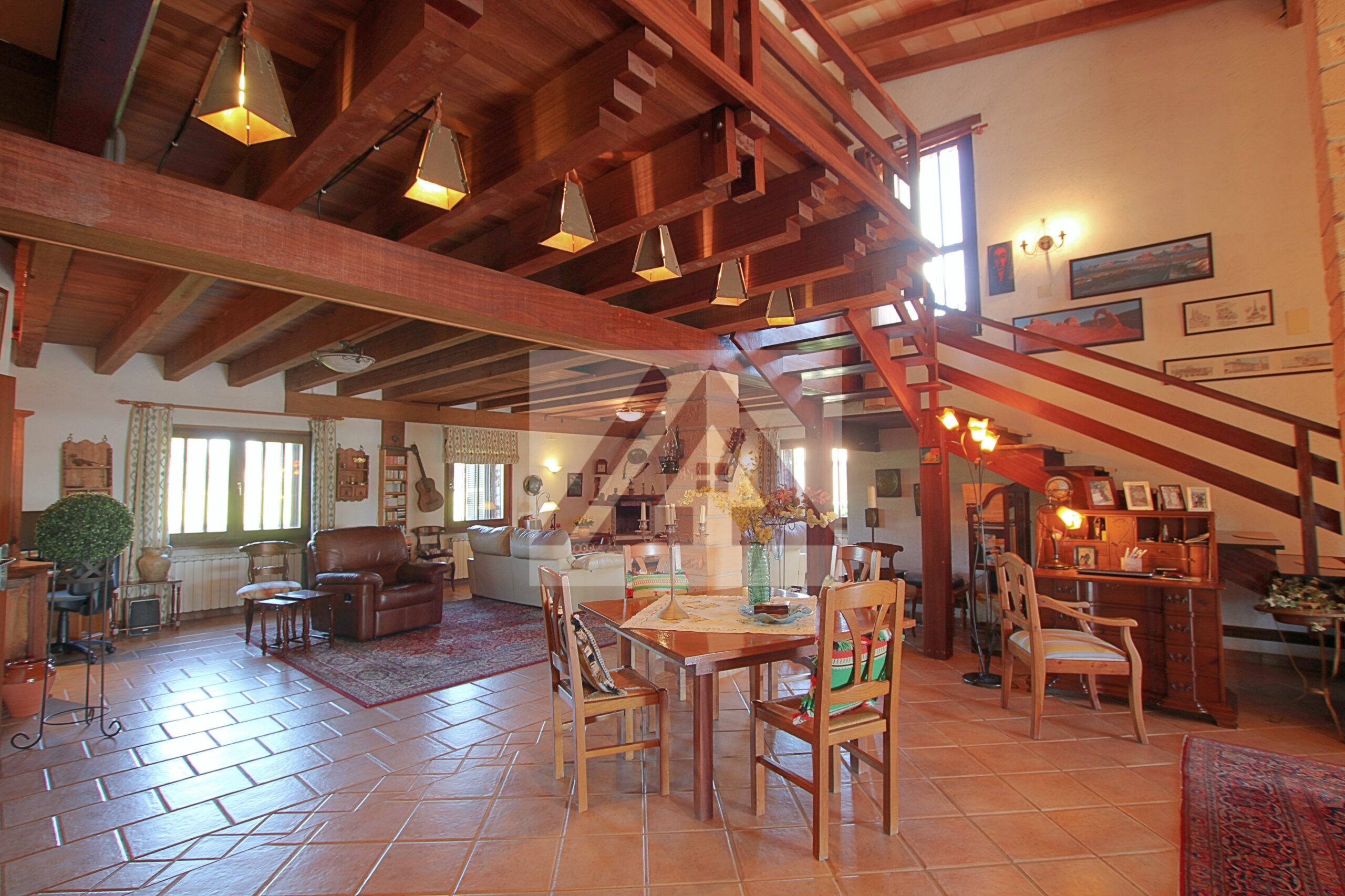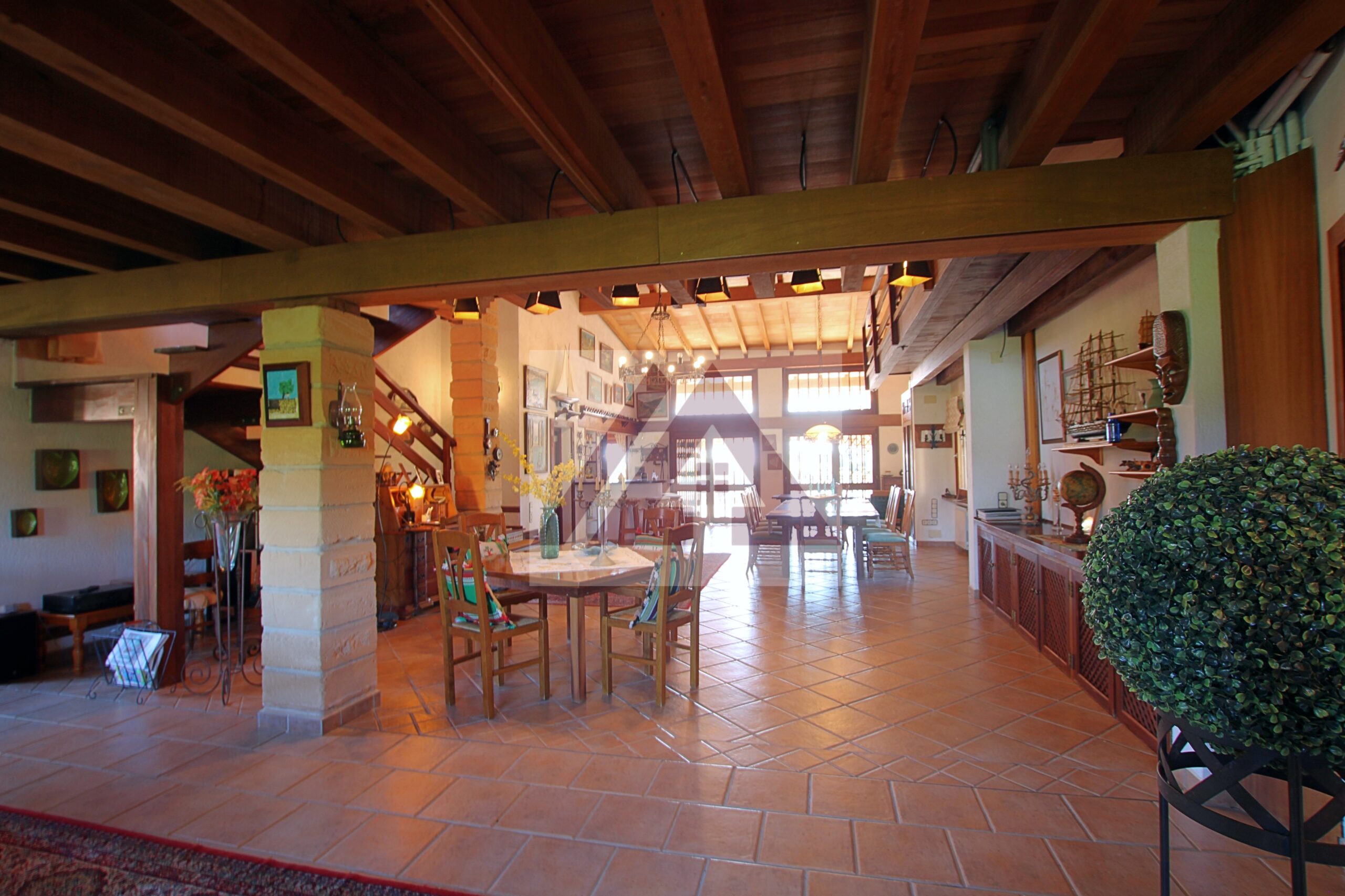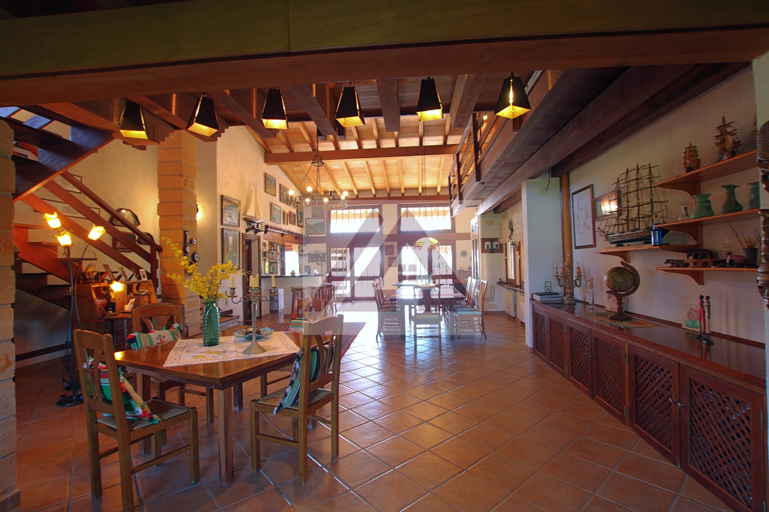 La vivienda principal deslumbra por su amplio salón con techos con vigas vista de madera, su zona de descanso con chimenea, su área de oficina, un amplio comedor y uno más apartado, un pequeño bar y una cocina perfectamente integrada cumplen los sueños de cualquier anfitrión.