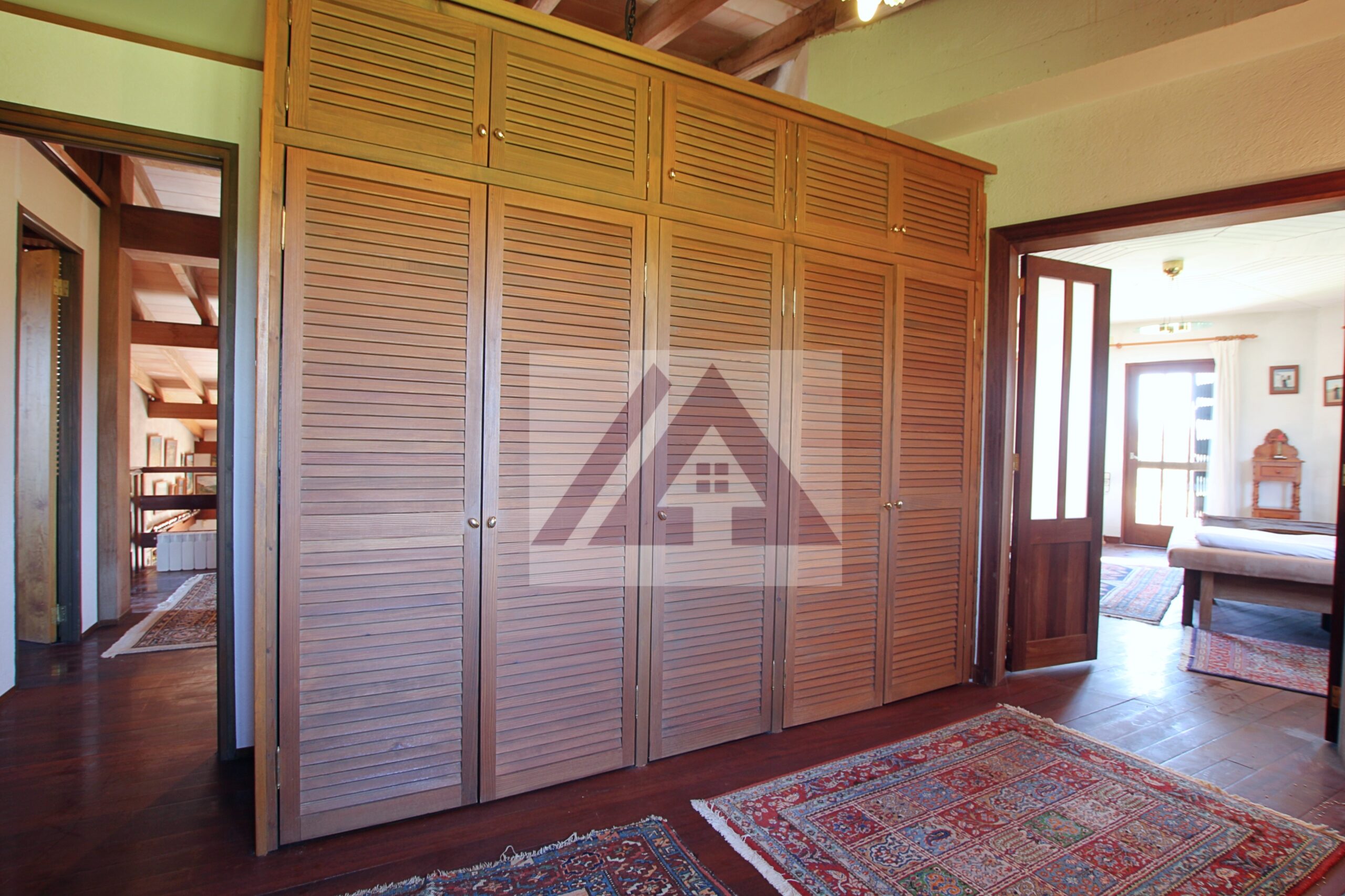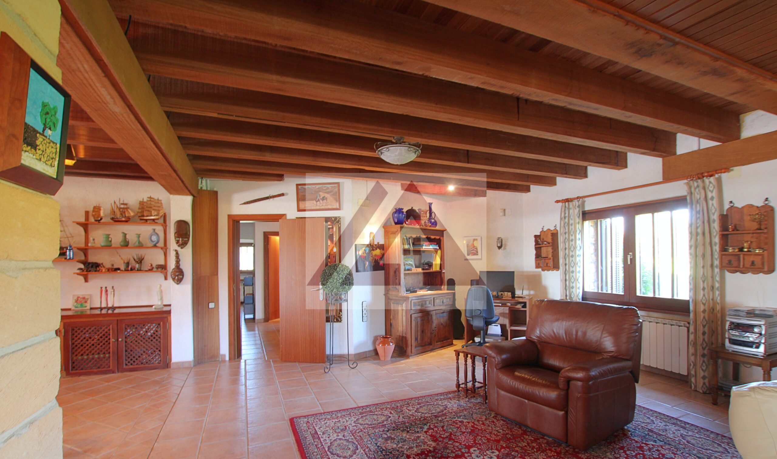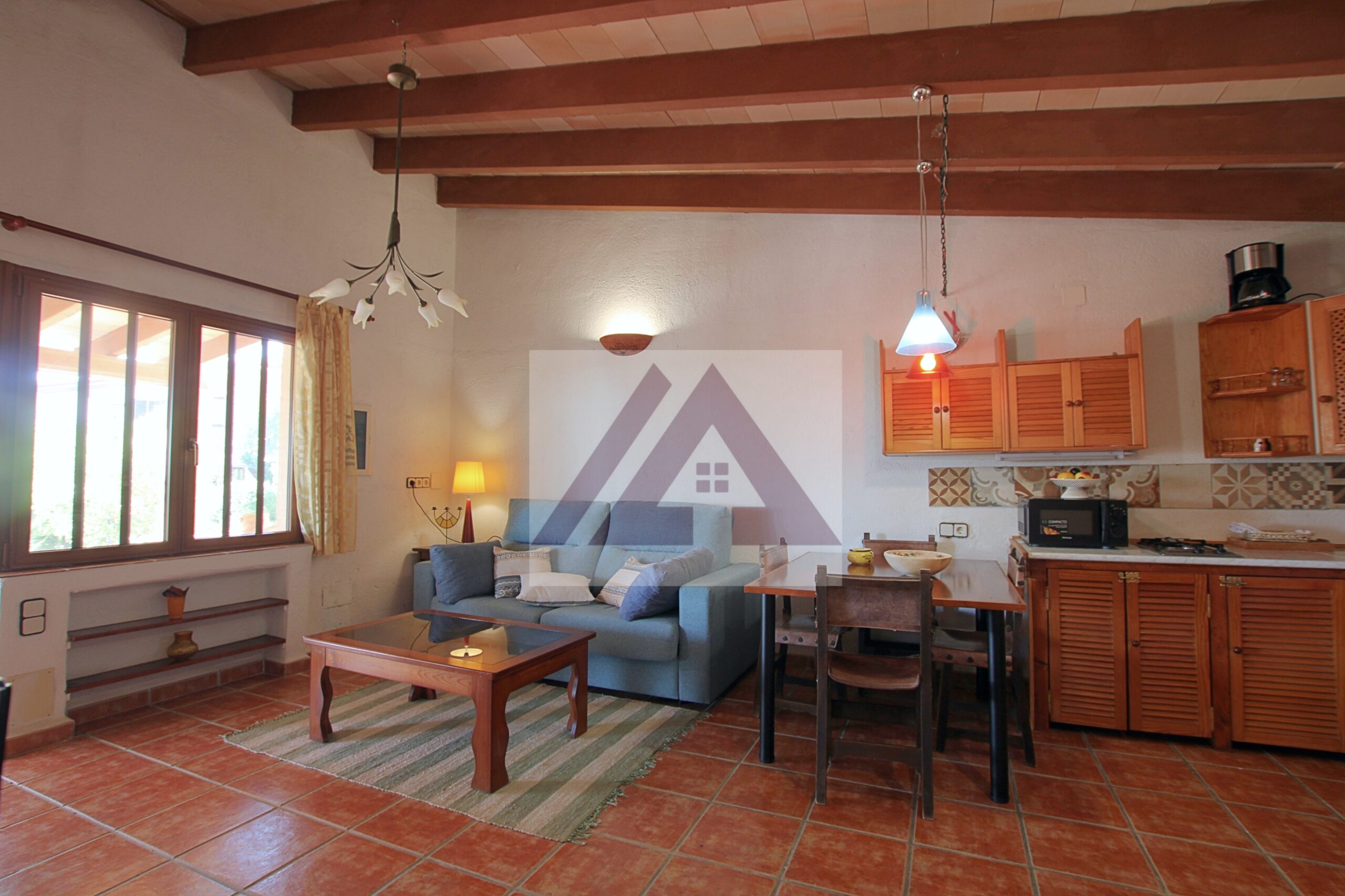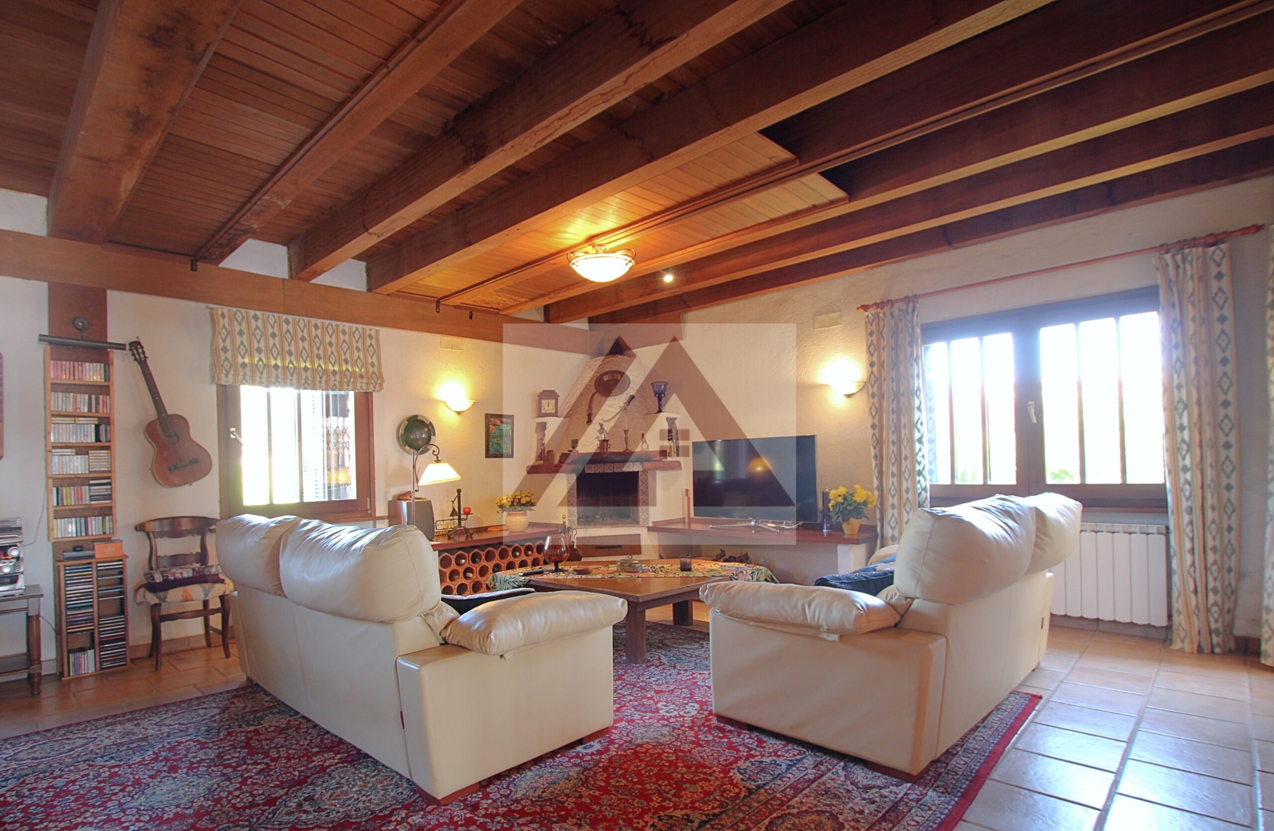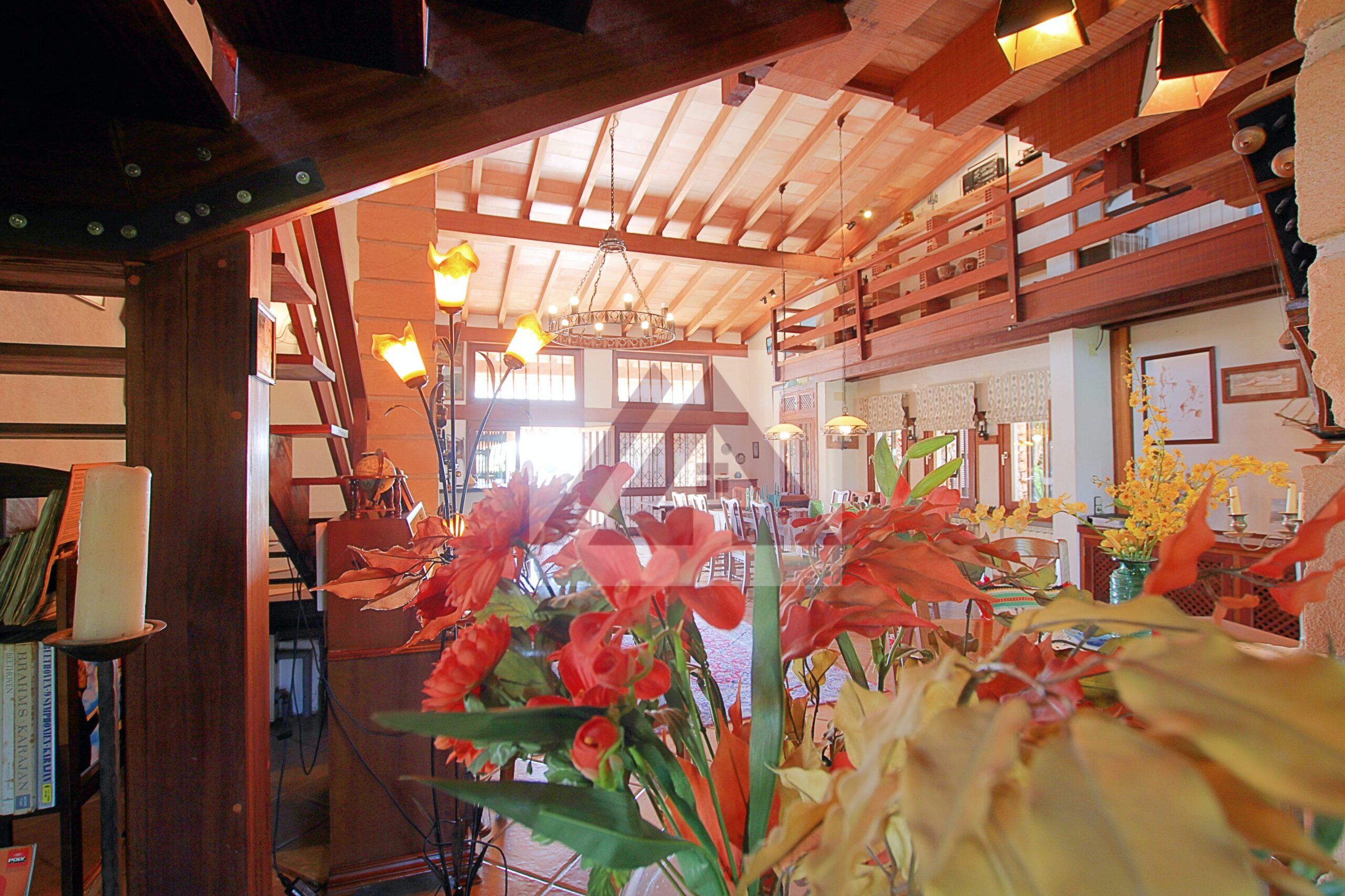 La vivienda principal deslumbra por su amplio salón con techos con vigas vista de madera, su zona de descanso con chimenea, su área de oficina, un amplio comedor y uno más apartado, un pequeño bar y una cocina perfectamente integrada cumplen los sueños de cualquier anfitrión.