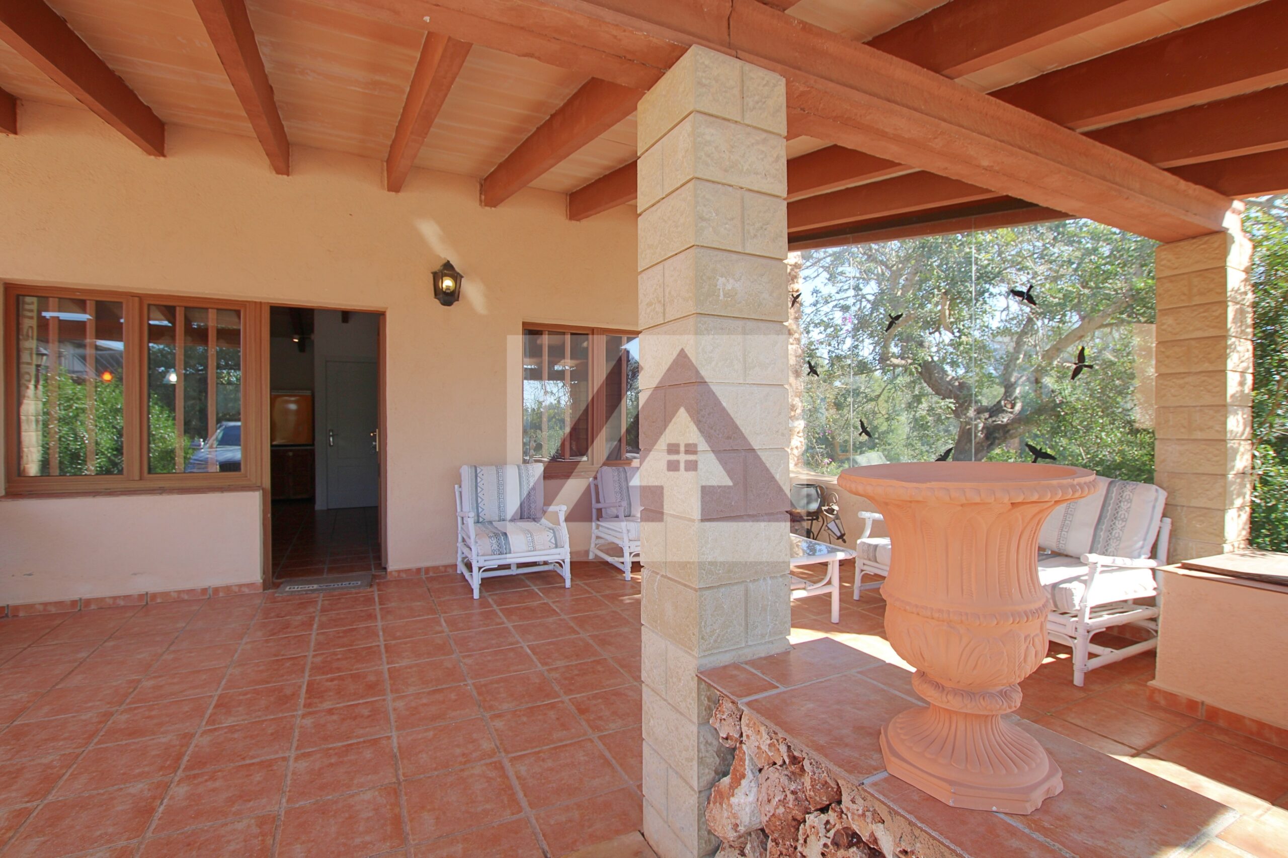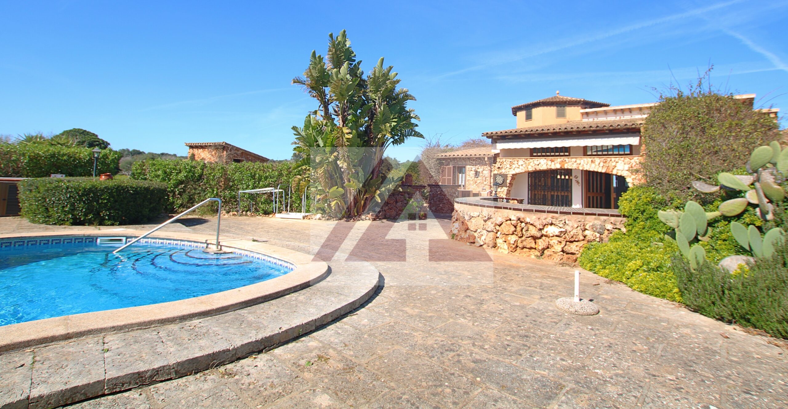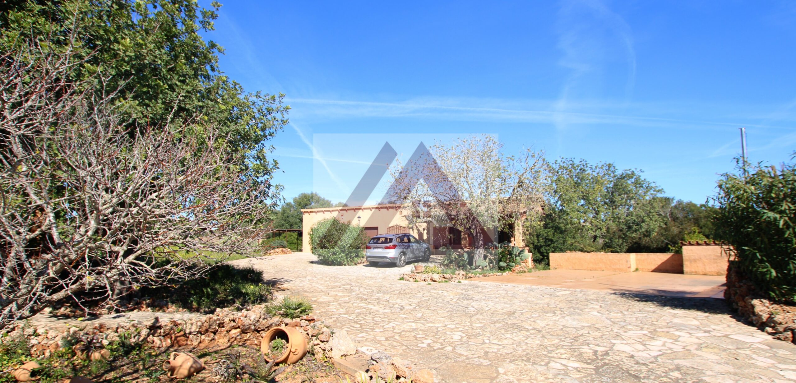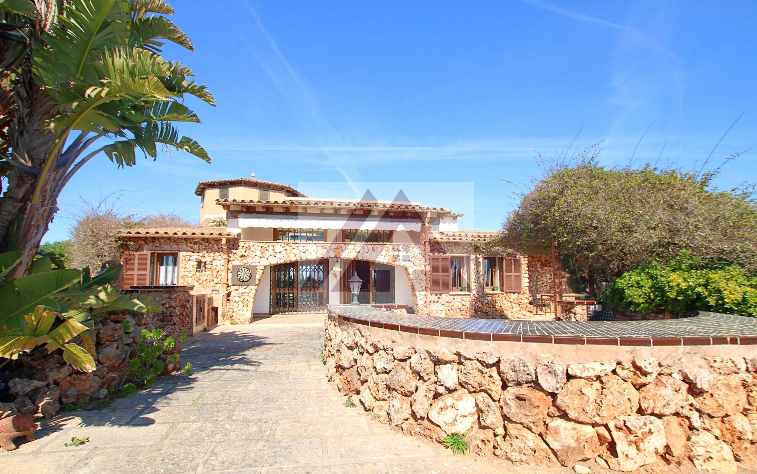 Por cómodo camino, a pocos minutos de Porto Cristo, entrando por la gran valla automática encontramos varias edificaciones, como la casa principal, la casita de invitados totalmente independiente, los garajes para aparcar varios coches, y otras construcciones utilizadas como almacenes para la herramienta.