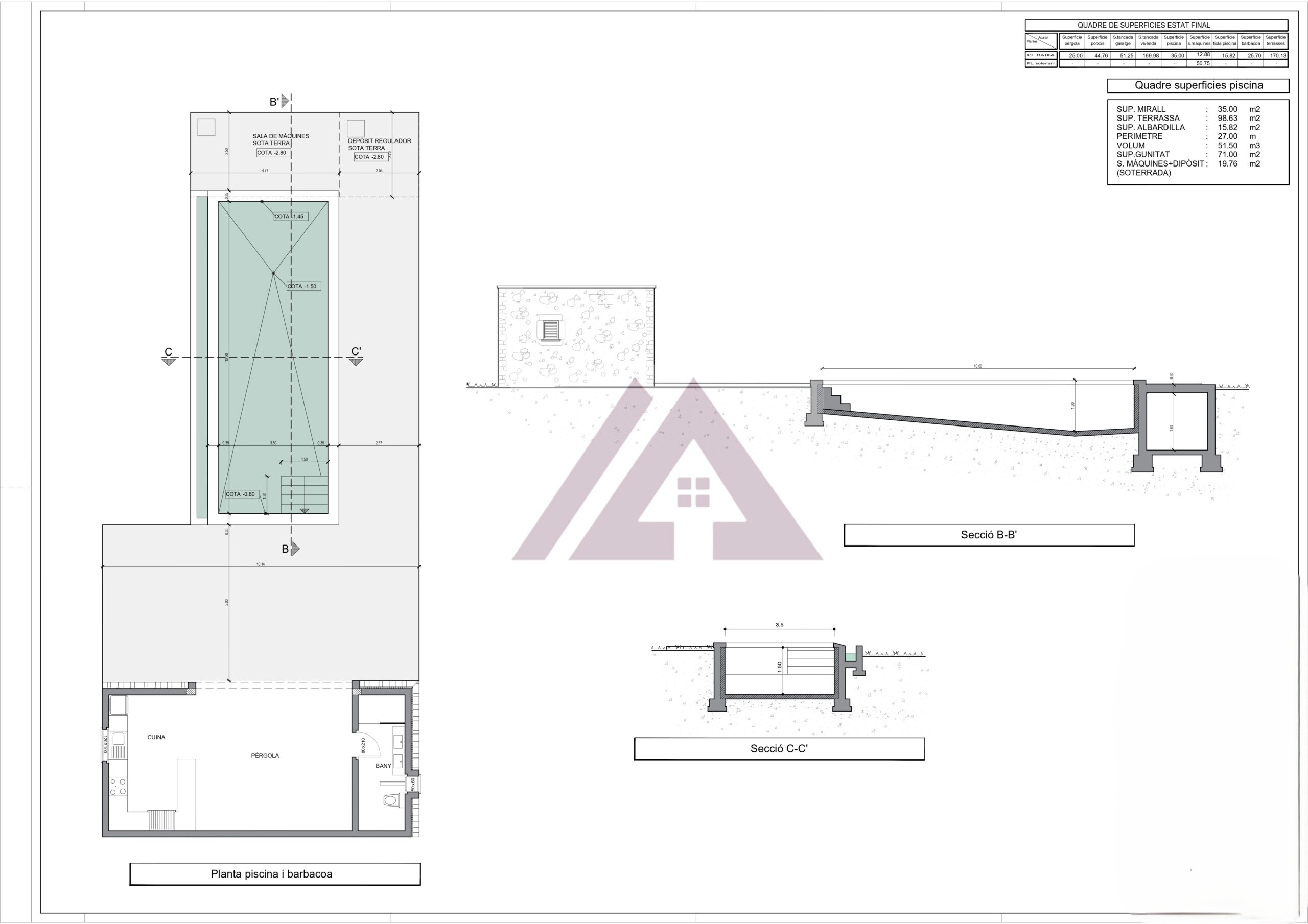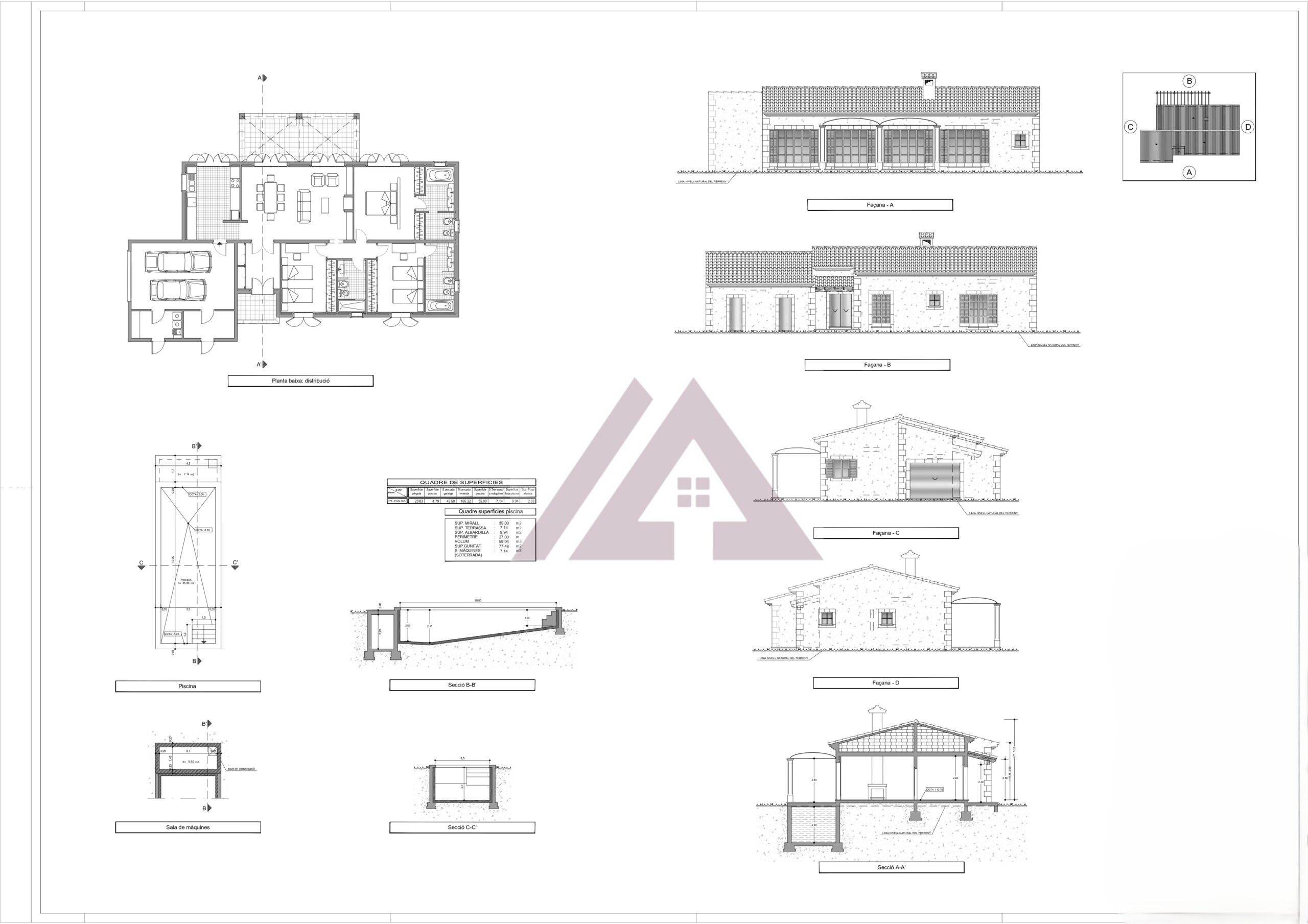 Der Außenbereich umfasst einen Grillplatz mit Pergola und ein Duschbad neben dem 35 m² großen Pool, inmitten von Gartenanlagen mit freiem Blick auf das Dorf.