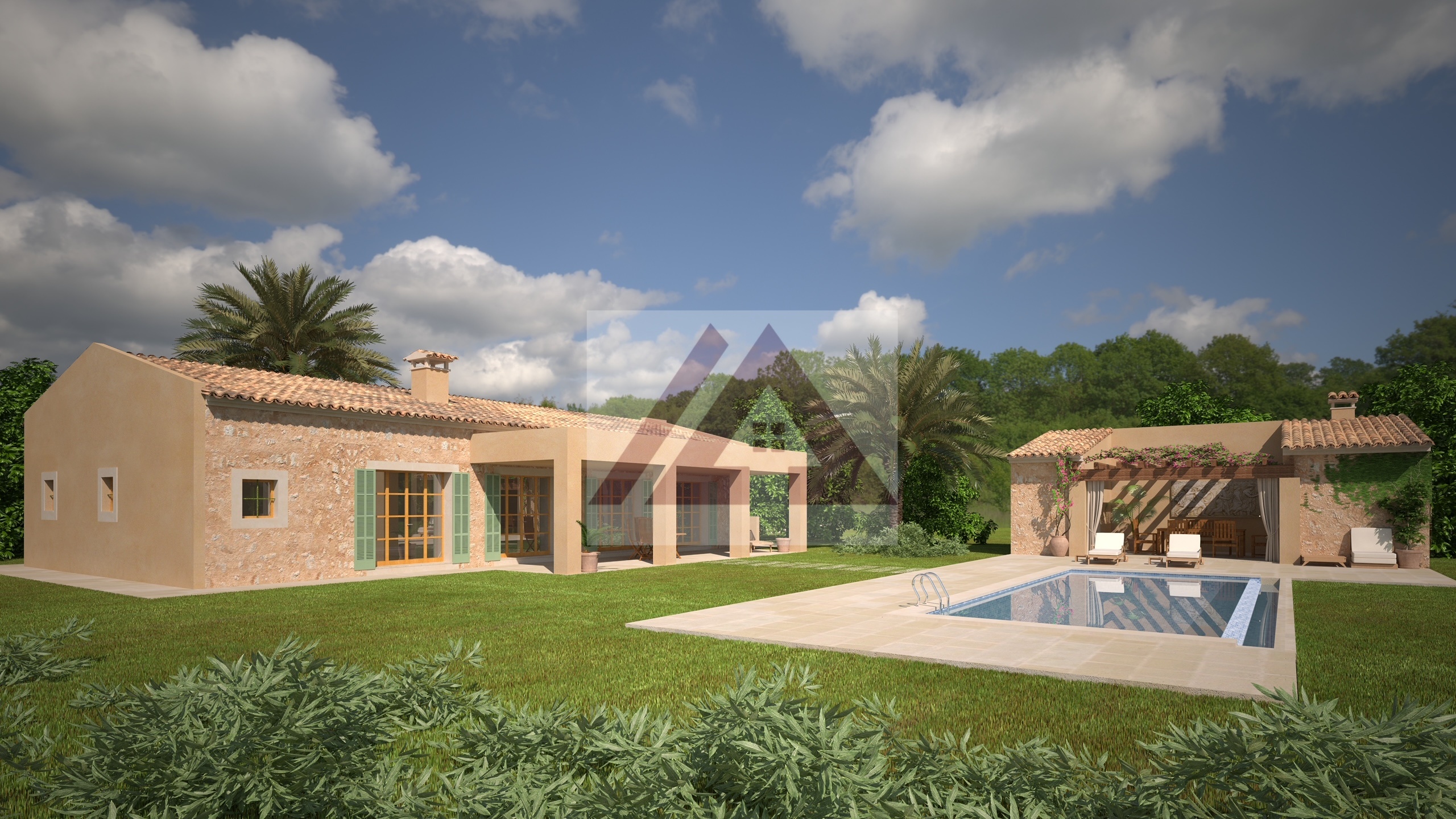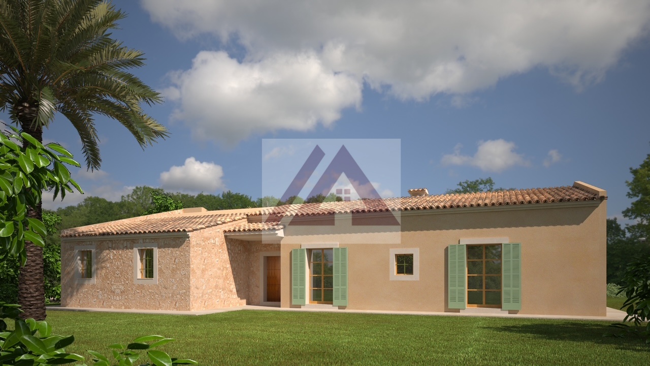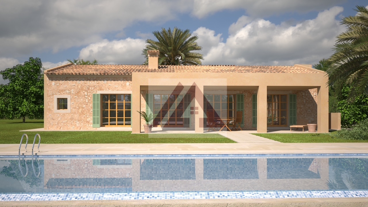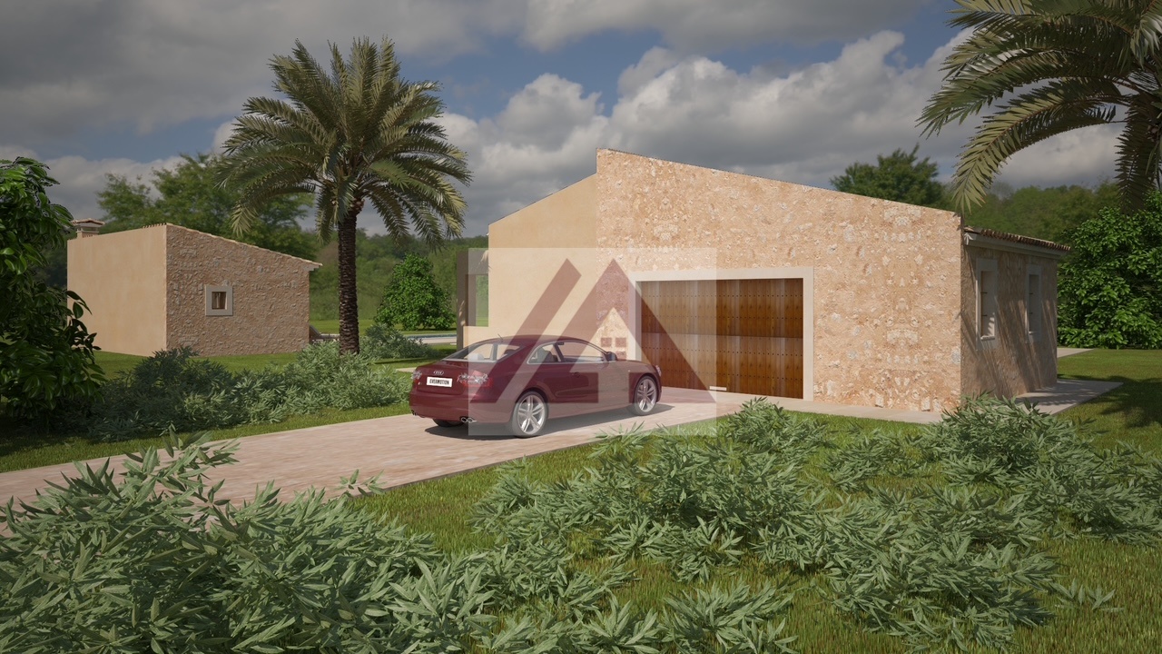 Nur zwei Minuten vom Dorf Porreres entfernt, in einer verkehrsarmen, sehr ruhigen Gegend mit schöner Aussicht, entsteht dieses herrliche Landhaus mit großer Garage, Grillplatz und Swimmingpool auf einem über 15.000 m² großen Grundstück, das vollständig von mallorquinischen Steinmauern umgeben ist und über ein automatisches Eingangstor verfügt.